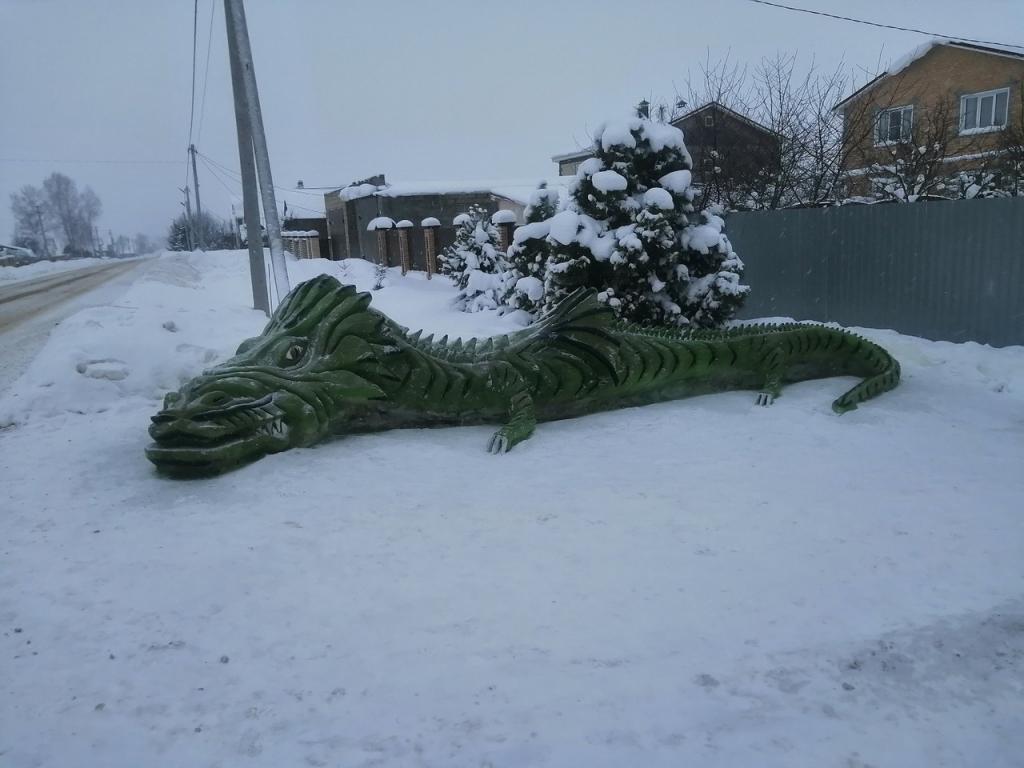 По словам местных жителей, снежная скульптура действительно впечатляет своей мощью и красотой. Зелёный дракон уютно расположился у дома своего «хозяина».