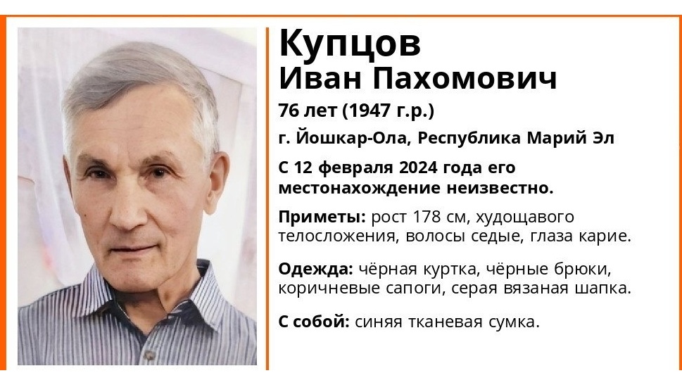 В Йошкар-Оле уже сутки неизвестно местонахождение 76-летнего Купцова Ивана Пахомовича. Он пропал вчера, 12 февраля.