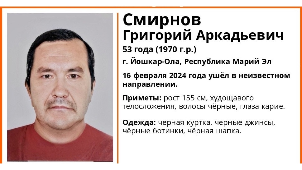 В Йошкар-Оле с пятницы, 16 февраля, неизвестно местонахождение 53-летнего Смирнова Григория Аркадьевича.