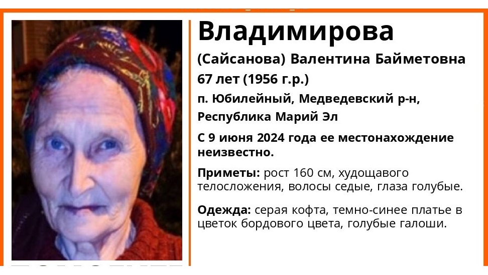 В Марий Эл пропала 67-летняя жительница посёлка Юбилейный Владимирова (Сайсанова) Валентина Байметовна.