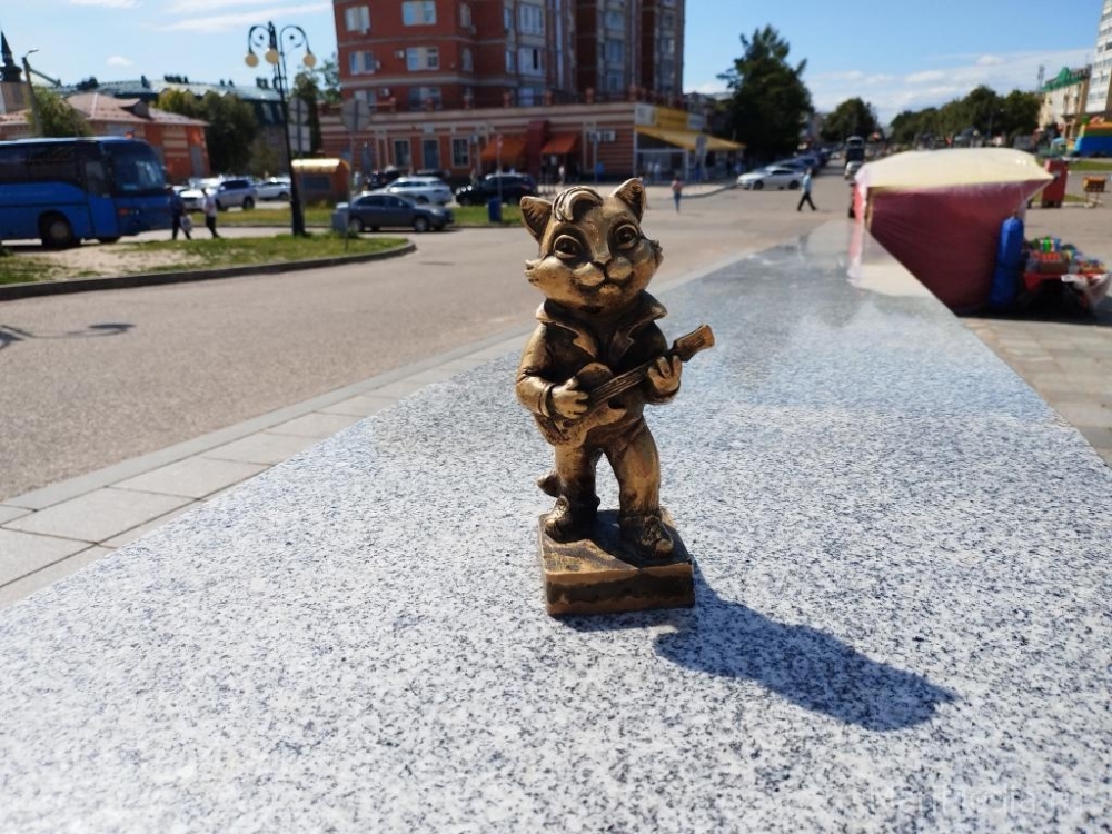 Внимательные горожане заметили, что фигурка котёнка повернулась на 180 градусов. Теперь котик Мурзик с гитарой смотрит на Благовещенскую башню.