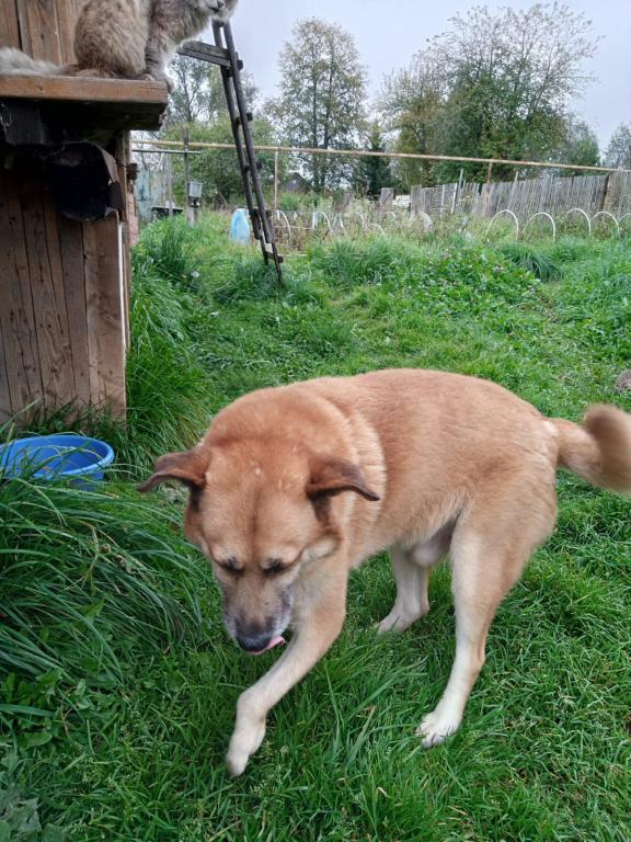 Одна собачка в возрасте, у второй только три лапки. На кошек и кур собаки не реагируют.
