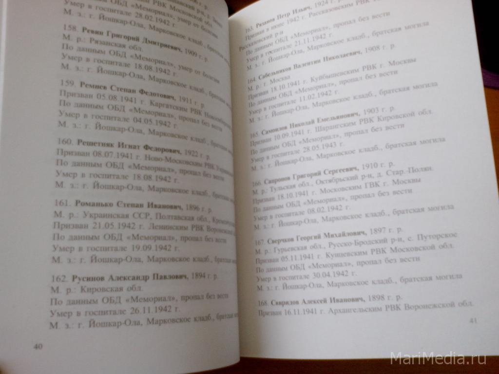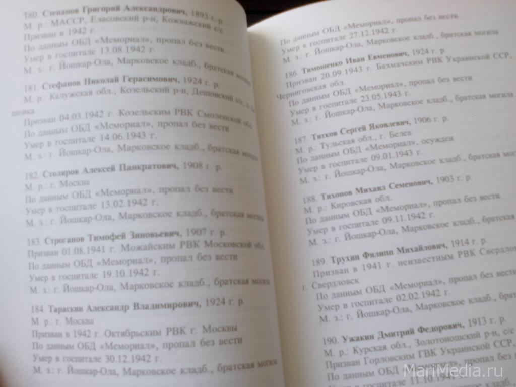 Как рассказал ИА «МариМедиа» командир поискового отряда «Демос» Дмитрий Шипунов, на Марковском кладбище вместе с нашими земляками в братской могиле захоронены 216 советских солдат, уроженцев из других краев и областей Советского Союза. В ходе поисковых работ удалось установить личности погибших. Причем, по словам Дмитрия Шипунова, 90% опознанных у себя на родине считаются пропавшими без вести. Это уроженцы Москвы, Подмосковья, Тульской области и других регионов.