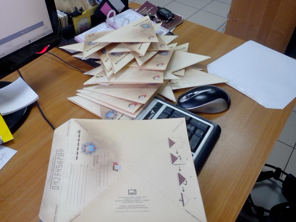МариМедиа, 8 апреля. В рамках празднования юбилейной даты — 70-летия Победы в ВОВ, в Марий Эл пришло более 12 000 «фронтовых» конвертов. Чтобы конверты приобрели законченный вид треугольника их необходимо было сложить. Для этого Почта России запустила акцию «Благодарность земляков — тепло ладоней». В рамках которой школьники, студенты, волонтёры, работники предприятий и организаций республики помогали майским подаркам для ветеранов приобрести законченный вид. Не остались в стороне и медийщики. Сотрудники компании МариМедиа без отрыва от производства собрали 500 «фронтовых» конвертов-треугольников.