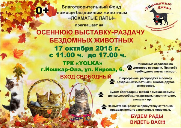 МариМедиа, 16 октября. В субботу, 17 октября, на территории ТРК «Елка» Благотворительный фонд «Лохматые лапы» проводит выставку-раздачу бездомных животных. Посетители выставки смогут обзавестись четвероногим другом. По словам организаторов, большинство животных: кошки, собаки, котята, щенки, стерилизованы и привиты.