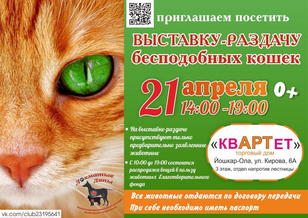 В субботу, 21 апреля, в ТД «Квартет» пройдёт выставка-раздача бездомных животных (3 этаж). Организаторами выступает благотворительный фонд помощи бездомным животным «Лохматые лапы». По словам активистов, все животные, представленные на выставке, здоровы, большая часть стерилизованы и привиты, имеют ветеринарный паспорт.