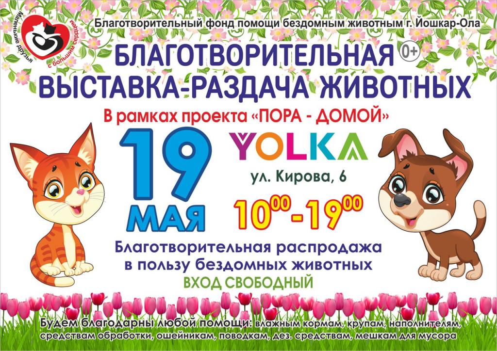 В субботу, 19 мая, в ТРЦ Yolka состоится выставка-раздача бездомных животных. Благотворительный фонд «Маленькие друзья с большим сердцем», в рамках проекта «Пора домой», пристраивают кошек и собак, котят и щенков в добрые руки. Все животные привиты и практически все — стерилизованы.