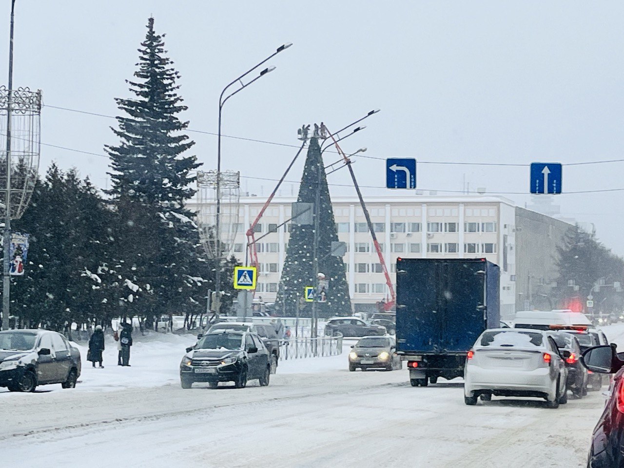 Первыми за демонтаж взялись работники ТЭЦ-1. Они обесточили конструкцию и сняли гирлянды с праздничной иллюминацией.