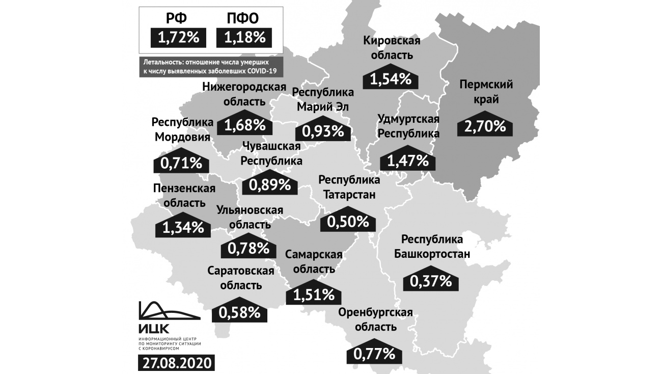 Информационный центр по мониторингу ситуации с коронавирусом подготовил новую инфографику по уровню летальности от коронавирусной инфекции в регионах Приволжского федерального округа по данным на 27 августа.