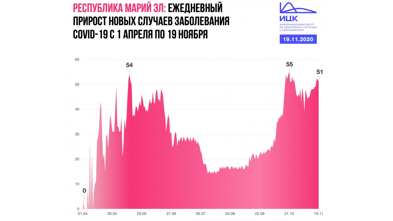 В Марий Эл рост заболеваемости коронавирусом наблюдается с начала октября. Рекордный прирост был зафиксирован 21 октября — 55 случаев, пиковые значения в ноябре были 17 и 18 числа — 52 случая, минимальный прирост был 5 ноября — 39 заболевших. За прошедшие сутки в республике выявлен 51 случай.