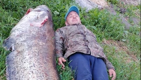 На фото автор изображен рядом с уловом, и видно, что сом значительно крупнее поймавшего его мужчины.