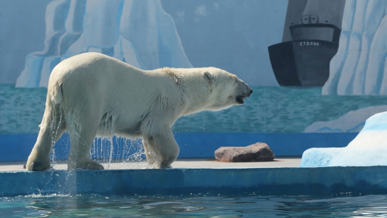 В вольере у белых медведей постоянно работает ледогенератор, который вырабатывает до 3 тонн снега в сутки, а вода в бассейне искусственно охлаждается до +14ºС.