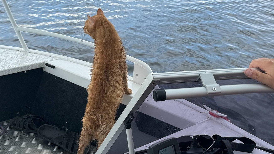 Курильский бобтейл, рыжий кот Симба, осваивает волжские просторы на катере со своими хозяевами. Глава семьи Вячеслав Скворнюк рассказал, что, когда катер едет с небольшой скоростью, то Симбе всё интересно, он осматривается, а если едут быстро, то ему уже на корме не нравится.