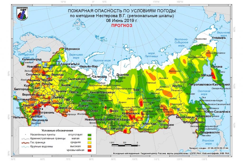 По прогнозам Федеральной Авиалесоохраны, в предстоящие субботу и воскресенье, 8 и 9 июня 2019 года, в 72 регионах России ожидаются средний (желтый), высокий (оранжевый) классы пожарной опасности в лесах по условиям погоды. В ряде регионов ожидается до чрезвычайного (красного) класса пожарной опасности.