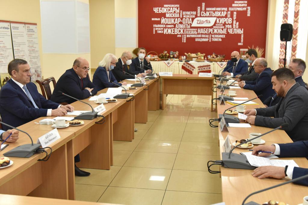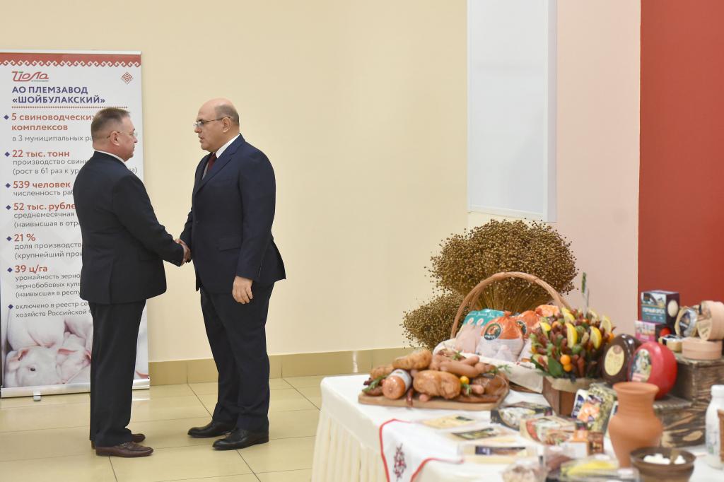 Михаил Мишустин после посещения производственного цеха Йошкар-Олинского мясокомбината познакомился с сельскохозяйственной продукцией ведущих производителей республики и встретился с руководителями агропромышленных предприятий — получателями субсидий по индивидуальной программе социально-экономического развития Республики Марий Эл на 2020-2024 годы.
