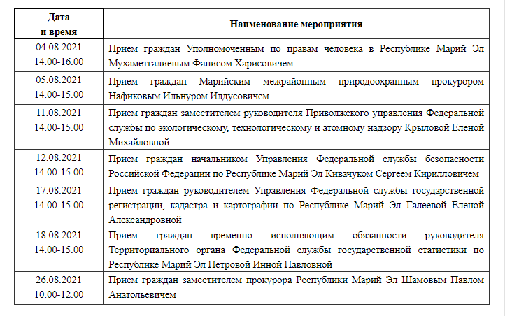 Опубликован график приёма граждан в приёмной Президента России в Марий Эл в августе.