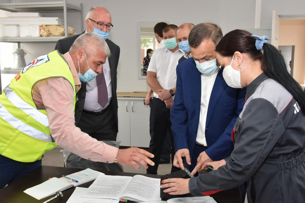 Генеральный директор предприятия Олег Малов продемонстрировал Александру Евстифееву асфальтосмесительную установку и лабораторию испытания образцов дорожного полотна.