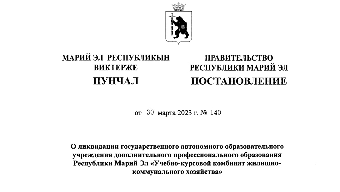 В Правительстве Марий Эл подписано постановление № 140 «О ликвидации государственного автономного образовательного учреждения дополнительного профессионального образования РМЭ «Учебно-курсовой комбинат жилищно-коммунального хозяйства».