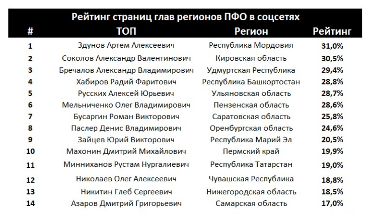 Лидером рейтинга стал губернатор республики Мородовия Артем Здунов. При относительно небольшой аудитории он добился самого высокого её вовлечения. На втором месте глава Кировской области Александр Соколов, благодаря открытости к комментариям подписчиков. Замыкает тройку лидеров Александр Бречалов из Удмуртской республики, с самой большой среди губернаторов Поволжья аудиторий в Одноклассниках.