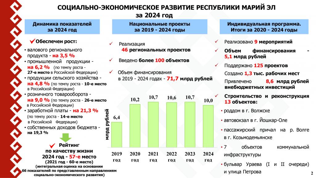 За 2024 год отмечен рост объёма ВРП на 3,5%. Увеличение производства продукции сельского хозяйства на 4,8% позволило занять 10 место по стране. Финансовый результат по отрасли равен 62,8 млрд рублей. По итогам года показатель промышленного производства достиг 319,8 млрд рублей, зафиксирован рост на 6,2% — по этому направлению Марий Эл находится на 27 месте среди всех субъектов РФ. В 2024 году было введено 484,4 тыс. кв. метров жилья. Уровень регистрируемой безработицы снизился в 1,6 раза и составил 0,24 %.