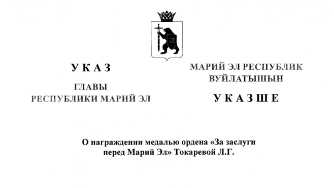 Глава Марий Эл Юрий Зайцев 15 мая подписал указ о награждении медалью ордена «За заслуги перед Марий Эл» Токареву Лидию Григорьевну — заведующего отделом по работе с детьми и молодёжью муниципального бюджетного учреждения культуры «Дворец культуры имени ХХХ-летия Победы».