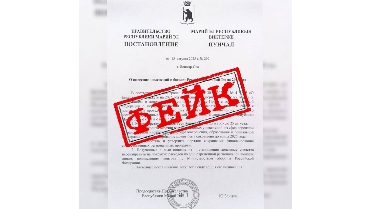 В сети распространили фальшивое постановление Правительства Марий Эл о внесении изменений в бюджет республики.