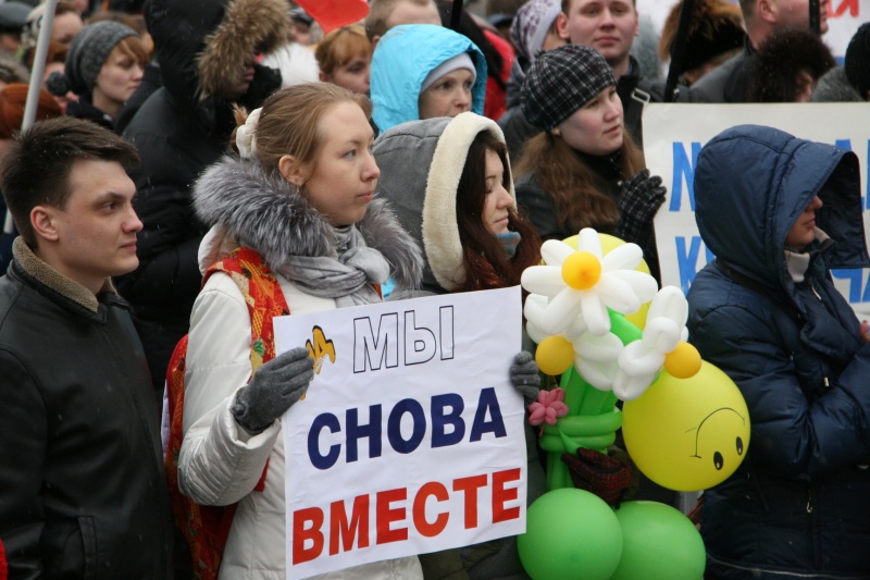 МариМедиа, 19 марта. Накануне после окончания рабочего дня йошкаролинцы вышли поддержать крымчан в их практически единодушном желании стать частью Российской Федерации. На площади Никонова собрались более четырех с половиной тысяч человек. Подобные акции случаются редко, но новость о том, что Крым, который исторически был частью России, вернулся домой, стала настоящим праздником. Радостное настроение витало в воздухе. «Поддерживаем Крымский референдум», «Добро пожаловать домой», «Мы снова вместе», «Молодцы, крымчане» и многие другие лозунги отразили приветственное настроение йошкаролинцев.