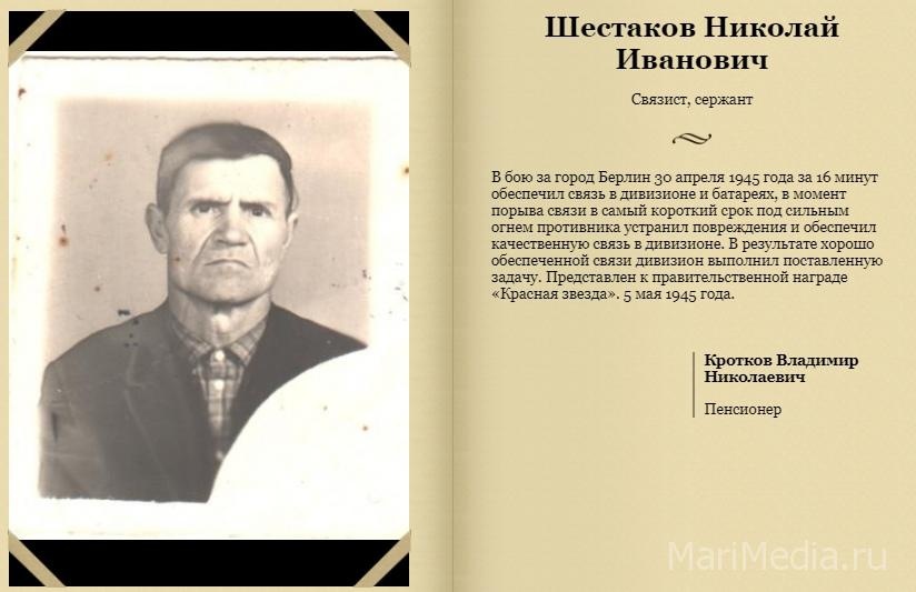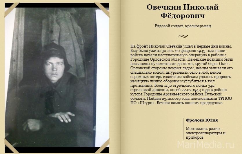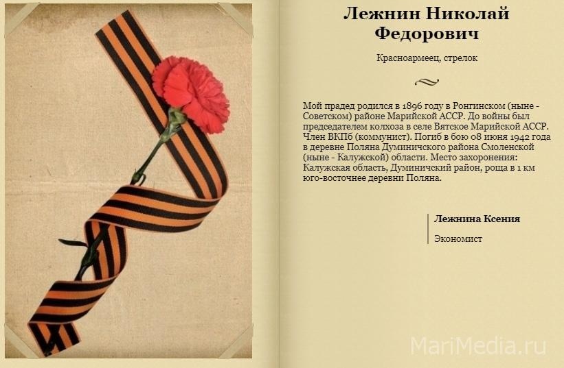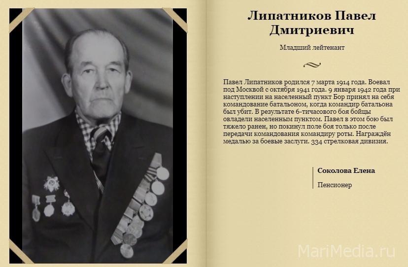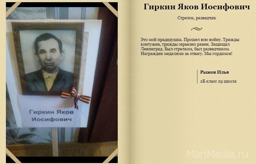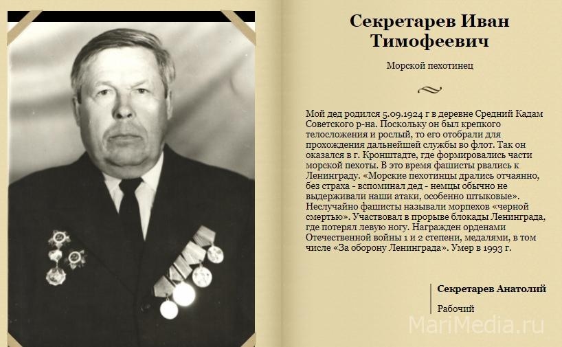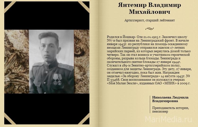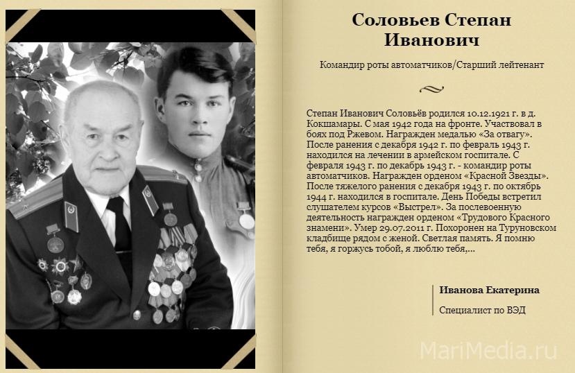 Проект «Поколение героев», стартовавший на портале «МариМедиа» 5 лет назад, пополняется новыми историями фронтовиков. Больше полусотни фотографий участников Великой Отечественной войны были присланы их родными и близкими в мае 2020 года. Имена и судьбы героев на портале «МариМедиа» — «Поколение героев».
