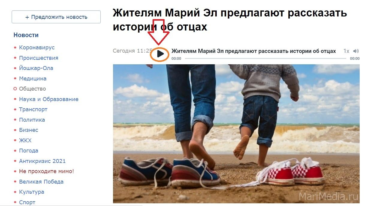 Бегунок располагается над новостью, чтобы прослушать новостной материал достаточно нажать на кнопку «плей».