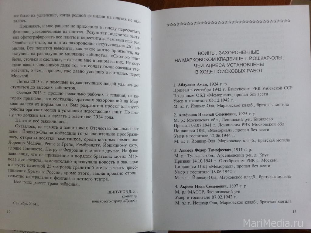 МариМедиа, 26 мая. Нескончаемым потоком в редакцию ИА «МариМедиа» идут письма со всех уголков страны, где удалось найти родственников павших воинов, захороненных на Марковском кладбище в Йошкар-Оле.