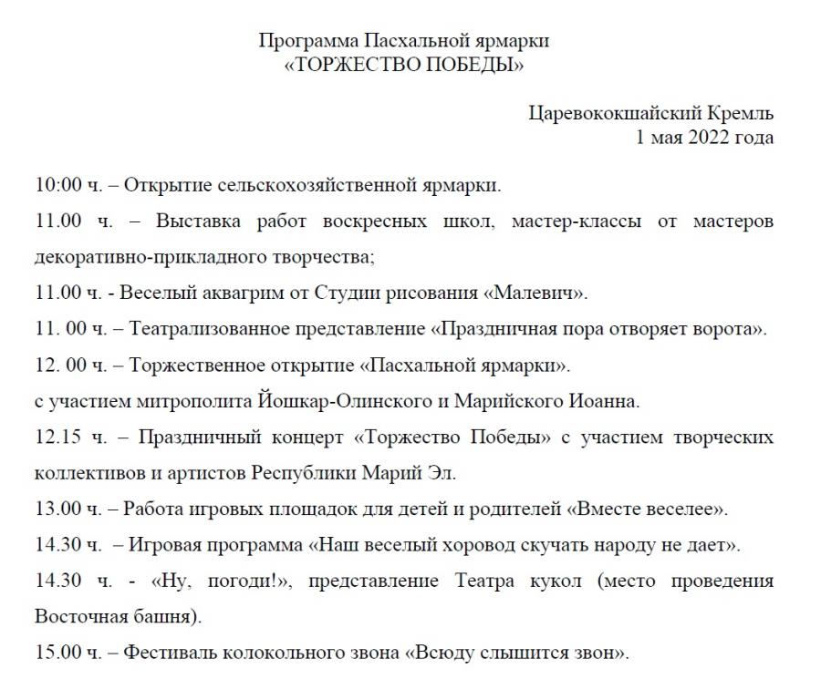 В воскресенье, 1 мая, в Йошкар-Оле на территории Царевококшайского кремля состоится Пасхальная ярмарка «Торжество Победы».