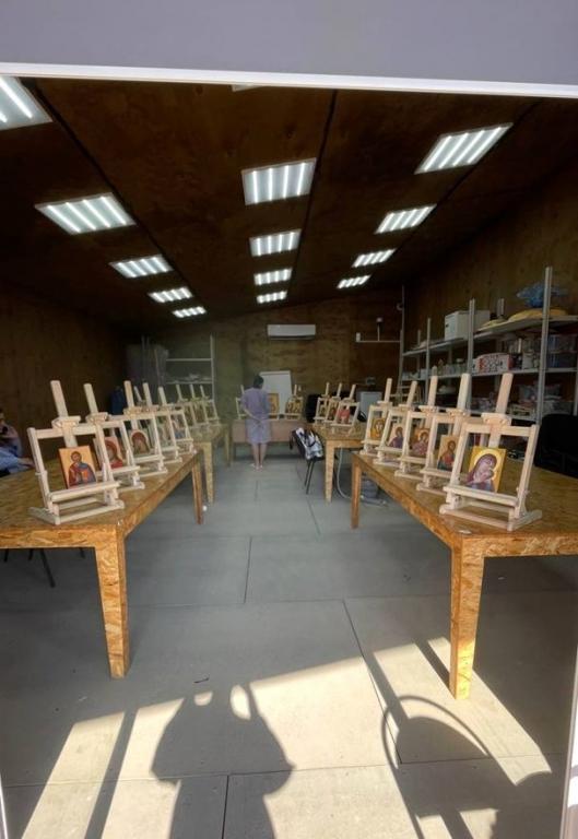 Итогом работы арт-школы стали 22 иконы. Две из них выполнены нашими иконописцами — Ольга написала небольшой оплечный образ Спасителя, а Ирина — поясную икону Христа.