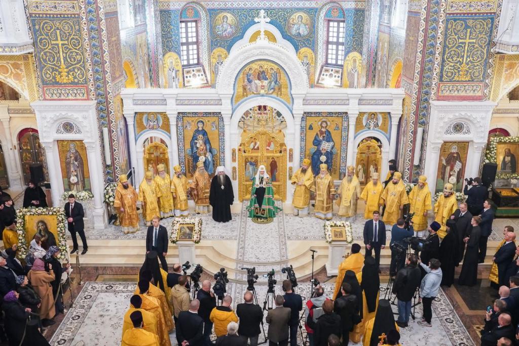 Святейший Патриарх Кирилл поблагодарил игуменью Сергию (Конкову) за труды и вручил ей памятный крест с украшением, в дар храму передал икону святителя Николая Чудотворца, верующим благословил раздать иконки Благовещения Пресвятой Богородицы с Патриаршим благословением.