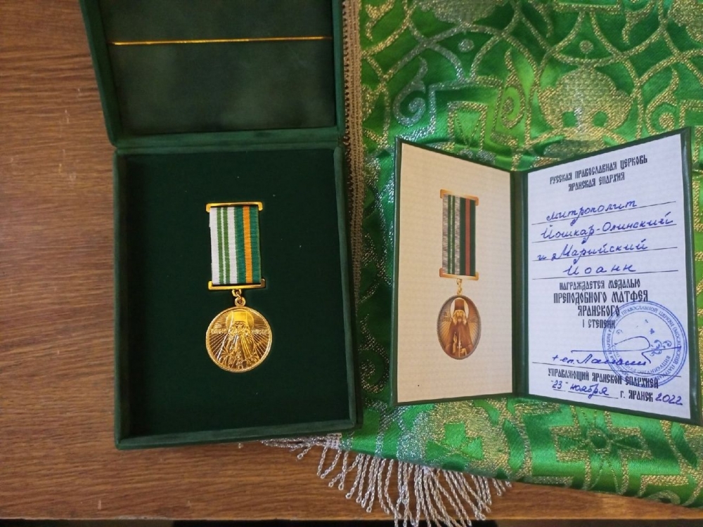 По окончании литургии управляющий Яранской епархией вручил митрополиту Йошкар-Олинскому и Марийскому Иоанну медаль преподобного Матфея Яранского I степени в благодарность за содействие в сборе материалов для канонизации святого и вклад в расширение его почитания среди верующих Марийской митрополии.