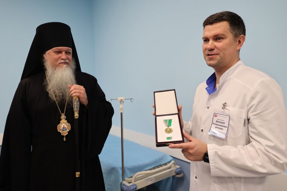 Главный врач Волжской ЦГБ Дмитрий Фризин принял из рук владыки Патриаршую награду — медаль Русской православной церкви «Патриаршая благодарность». Епископ сообщил, что эту награду его благословил передать Святейший Патриарх Кирилл.