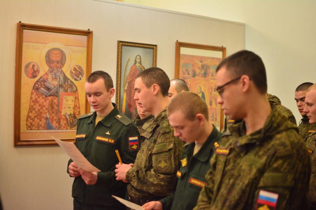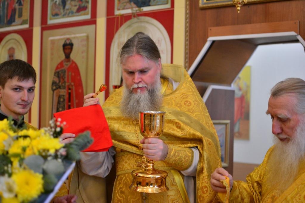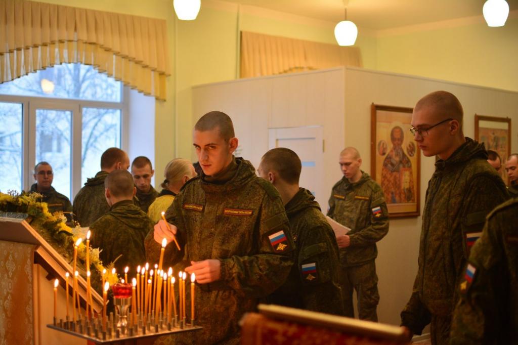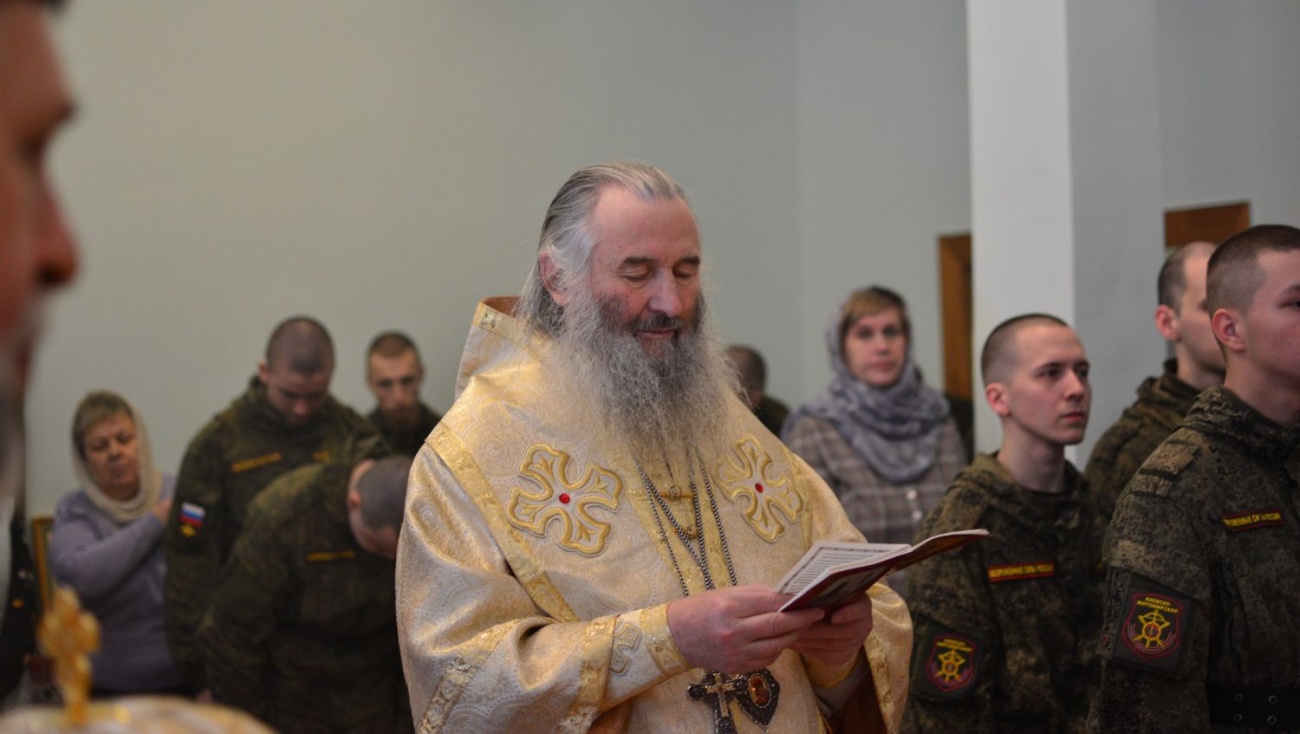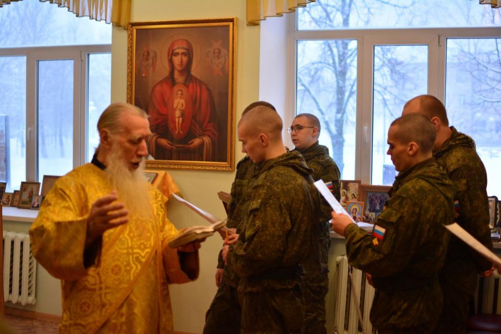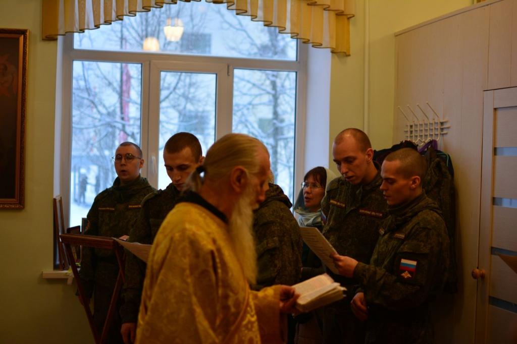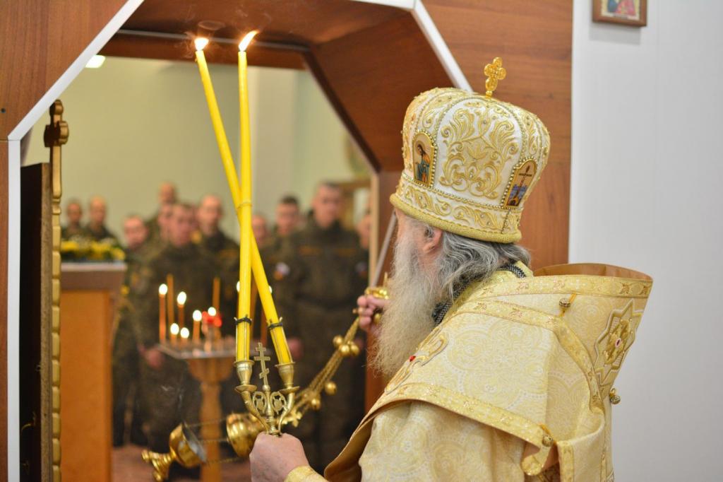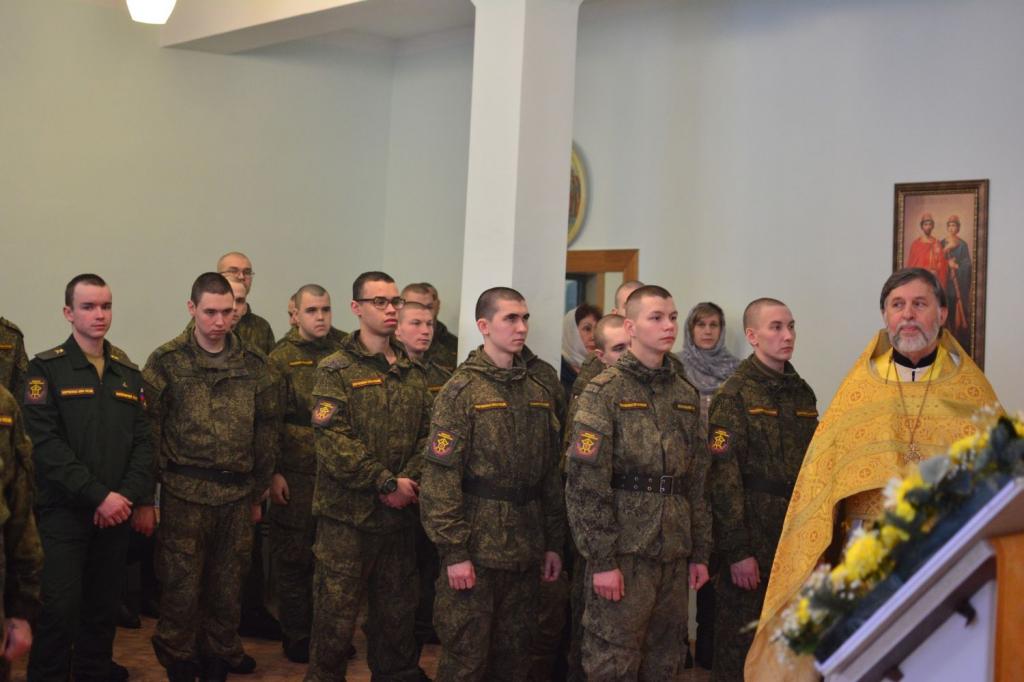 Владыке сослужили полковой священник иерей Георгий Колотов, настоятель храма преподобного Серафима Саровского протоиерей Александр Бачурин и протодиакон Михаил Козловский. Песнопения исполнял сводный хор под руководством регента Ирины Лебедевой.