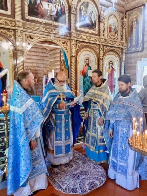 Литургию в недавно построенном храме Покрова Пресвятой Богородицы провели несколько священнослужителей. Песнопения исполнял хор храма села Владимирское.