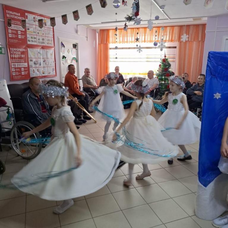 Ребята подготовили для пациентов учреждения праздничный концерт. Дети читали стихи, пели, танцевали, играли на музыкальных инструментах. Завершили выступление театрализованным представлением, прославляющим Христа.