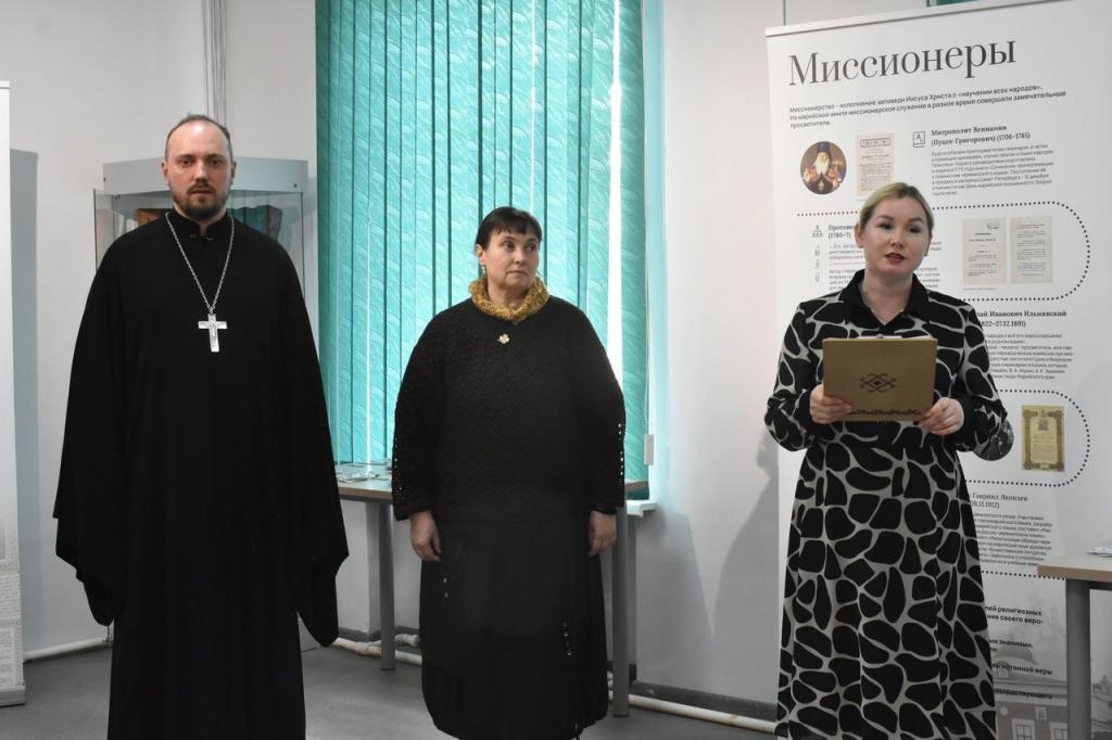 Выставку открыли настоятель Свято-Никольского храма иерей Антоний Блинов и старший научный сотрудник Музея истории православия Йошкар-Олы Светлана Каплунова.