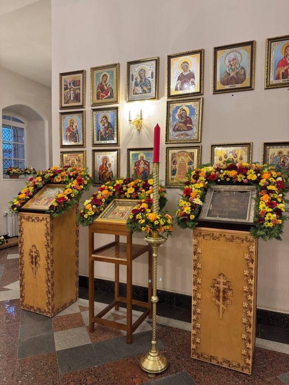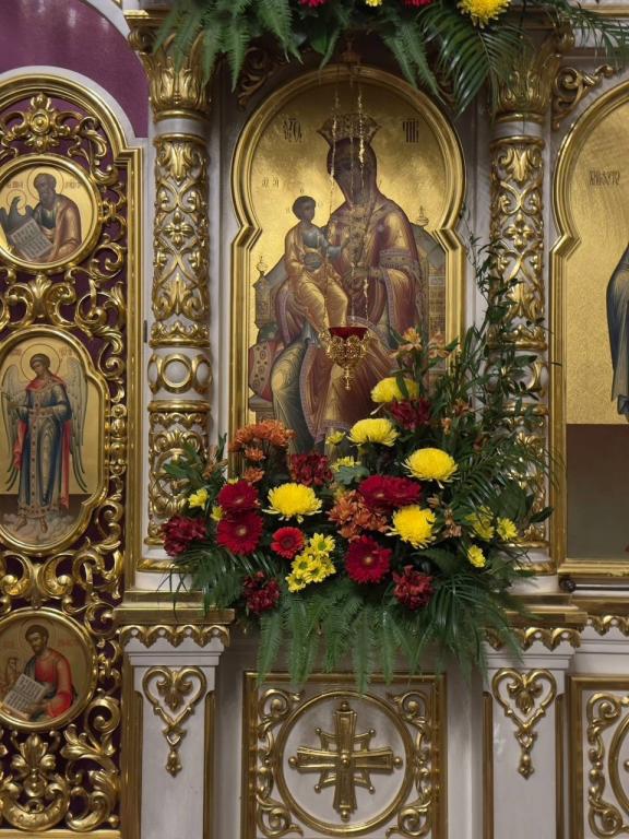 Благоукрасители оформили цветами иконы и различные церковные принадлежности, которые используются в богослужении.