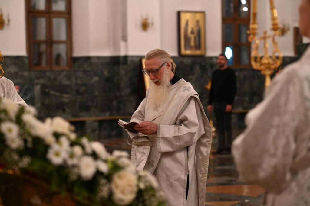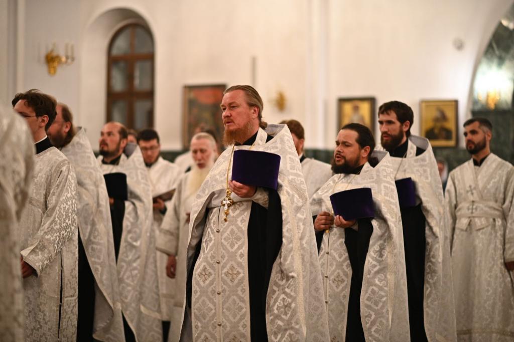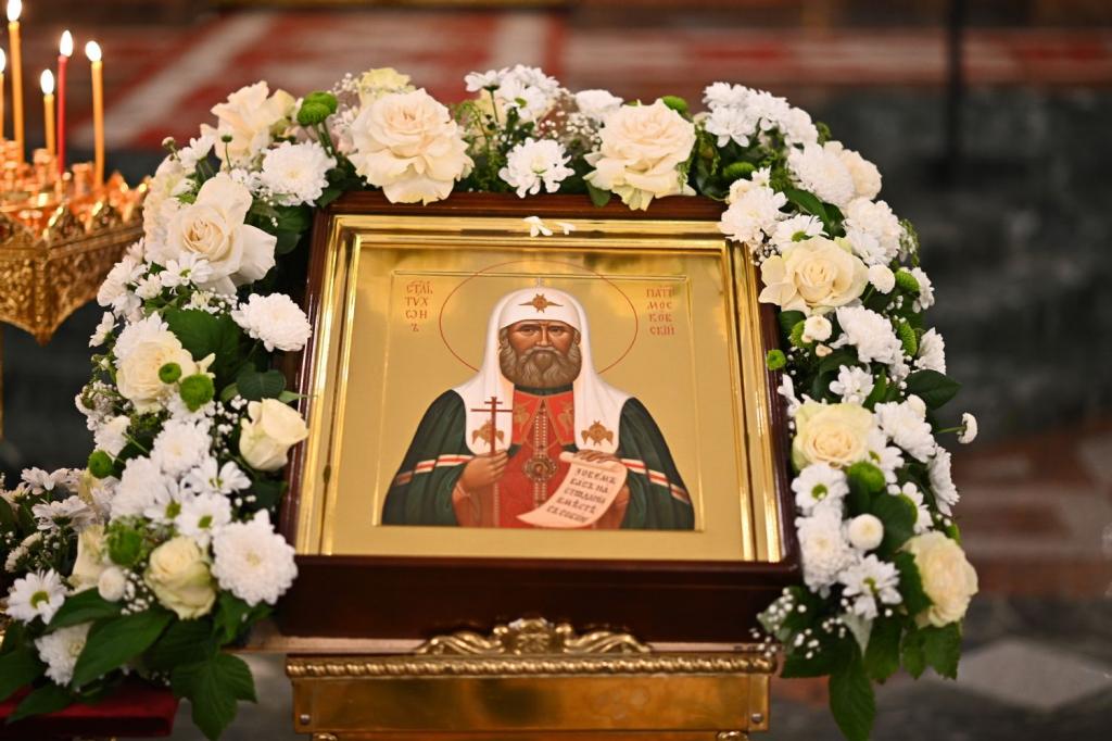 Святыня была установлена в центре собора, после чего владыка в сослужении духовенства кафедрального собора и храмов города совершил молебен святителю Тихону.