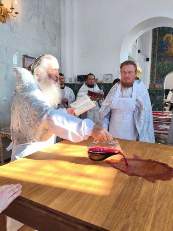 После этого началась Божественная литургия на новоосвящённом престоле. В завершении митрополит обратился к собравшимся с архипастырским словом и подробно разъяснил духовный смысл всех священнодействий, совершаемых при освящении храма и престола.