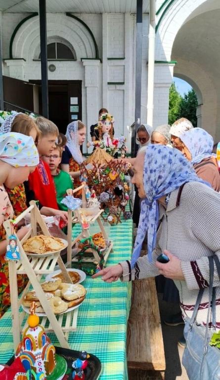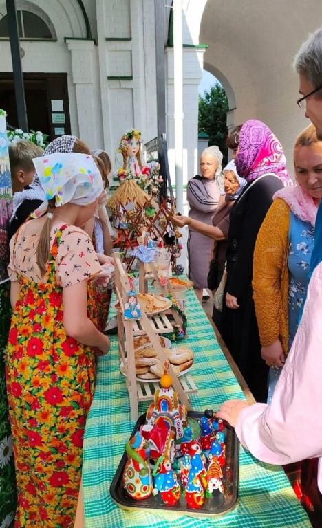 С раннего утра у входа в храм были расставлены столы с разнообразной домашней выпечкой — пирогами, блинами, сладкими десертами. Ребята, облачившись в народные костюмы, сами встали за прилавок.