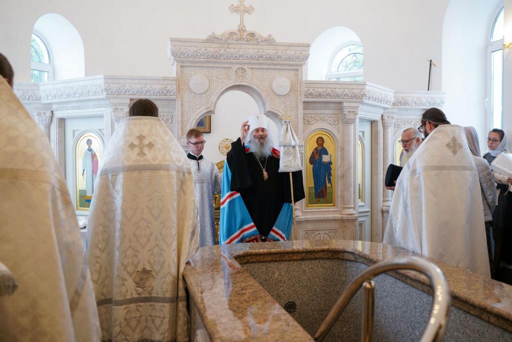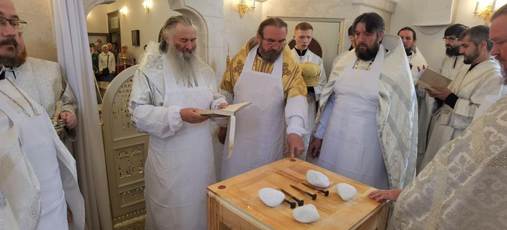 Освящение храма началось с торжественной встречи митрополита Иоанна, который под пение тропарей внес в храм частицы мощей святых Вифлеемских мучеников-младенцев и священномученика Владимира Четверина, которые были вложены в престол и в антиминс.