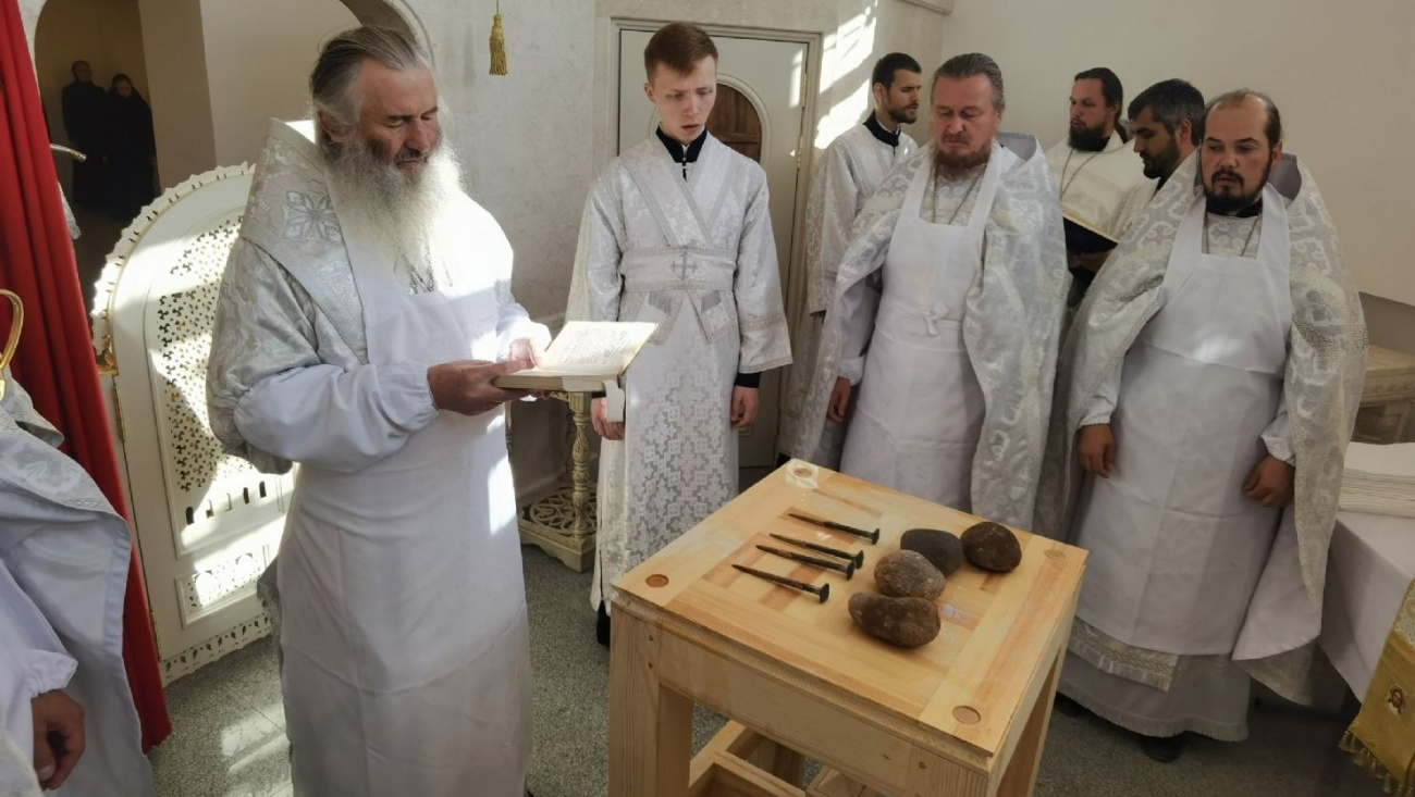 Освящение храма началось с торжественной встречи митрополита, который под пение тропарей внес в храм частицы мощей святых Вифлеемских мучеников-младенцев и священномученика Владимира Четверина, которые были вложены в престол и в антиминс.