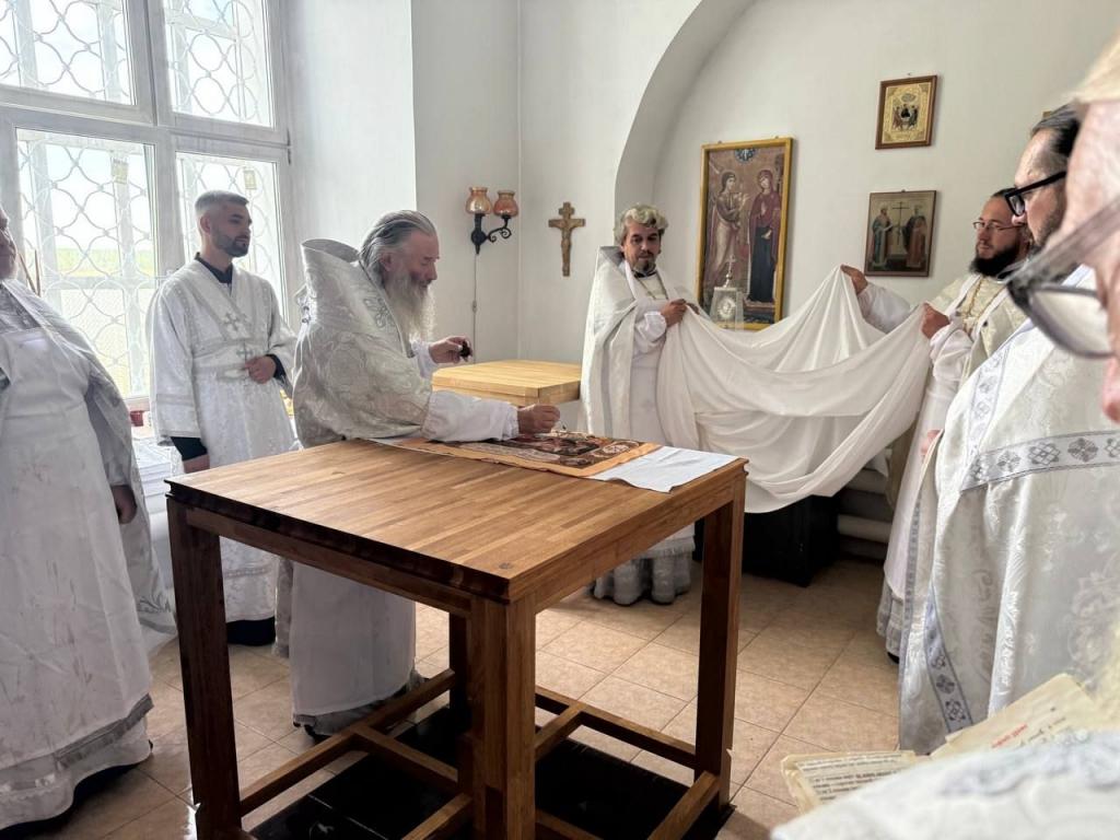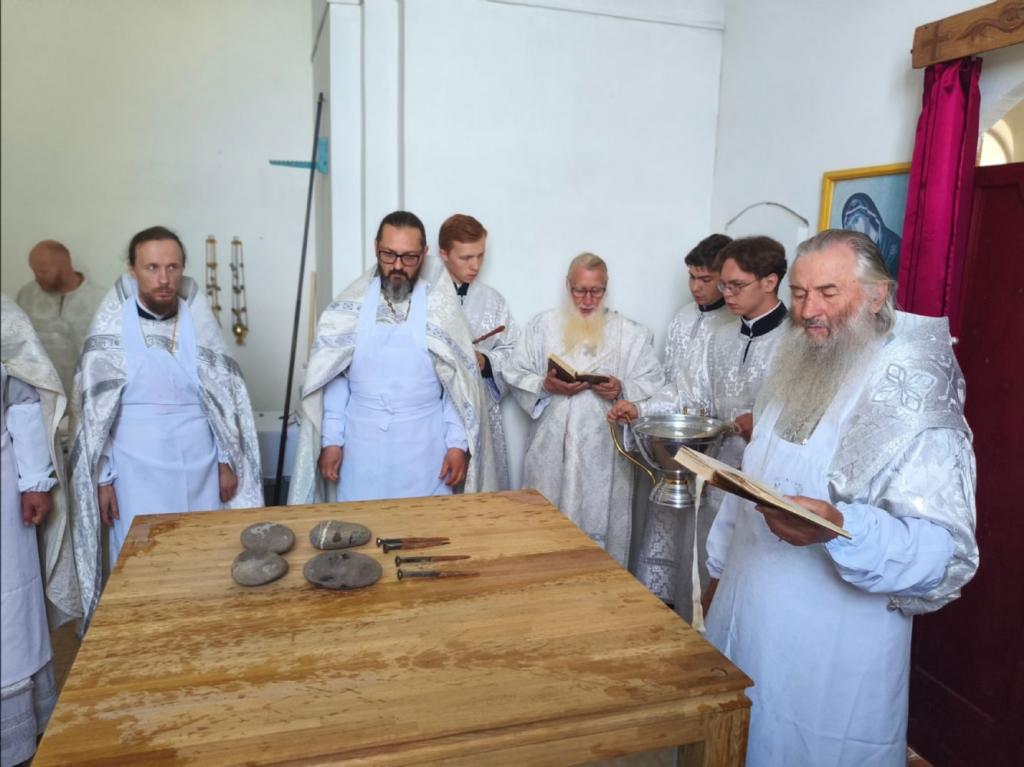 Освящение началось с торжественной встречи владыки. Под пение тропарей он внёс в храм частицы мощей святых Вифлеемских мучеников-младенцев и священномученика Владимира Четверина. Святыни были вложены в престол и в антиминс.