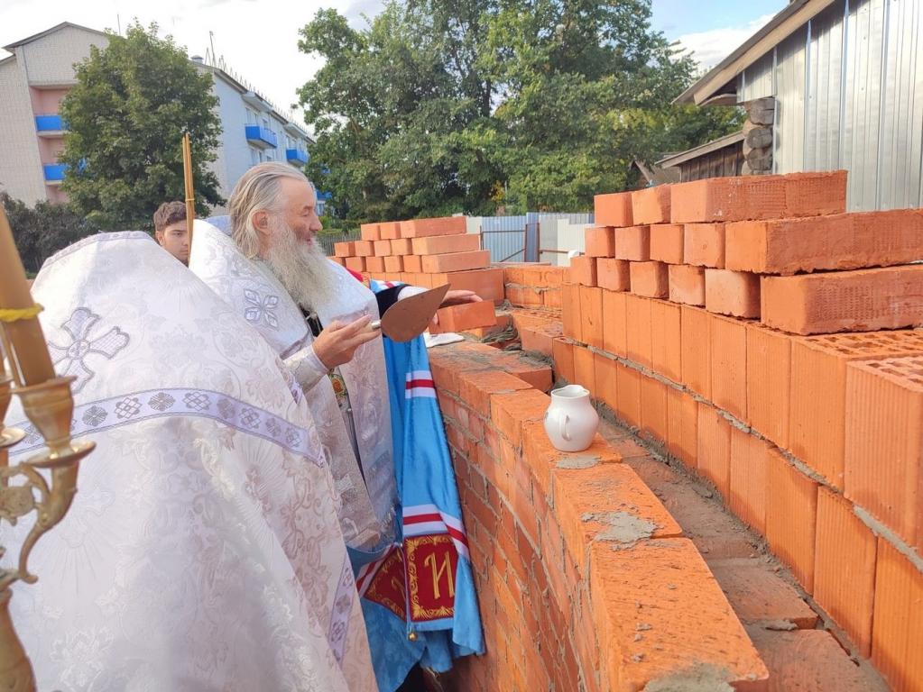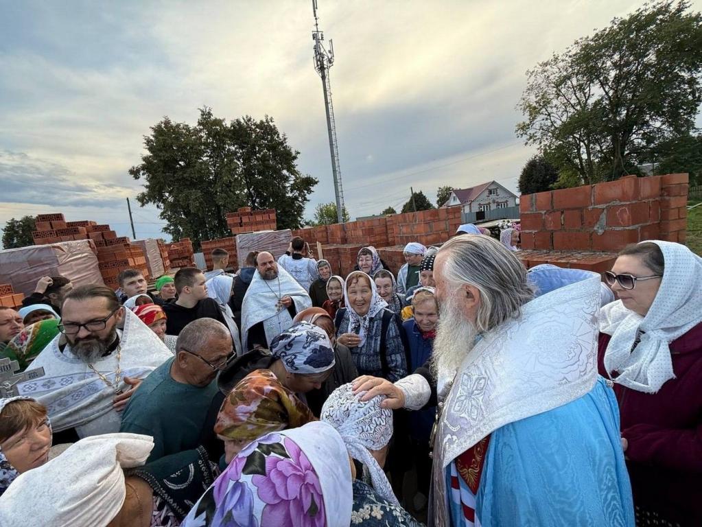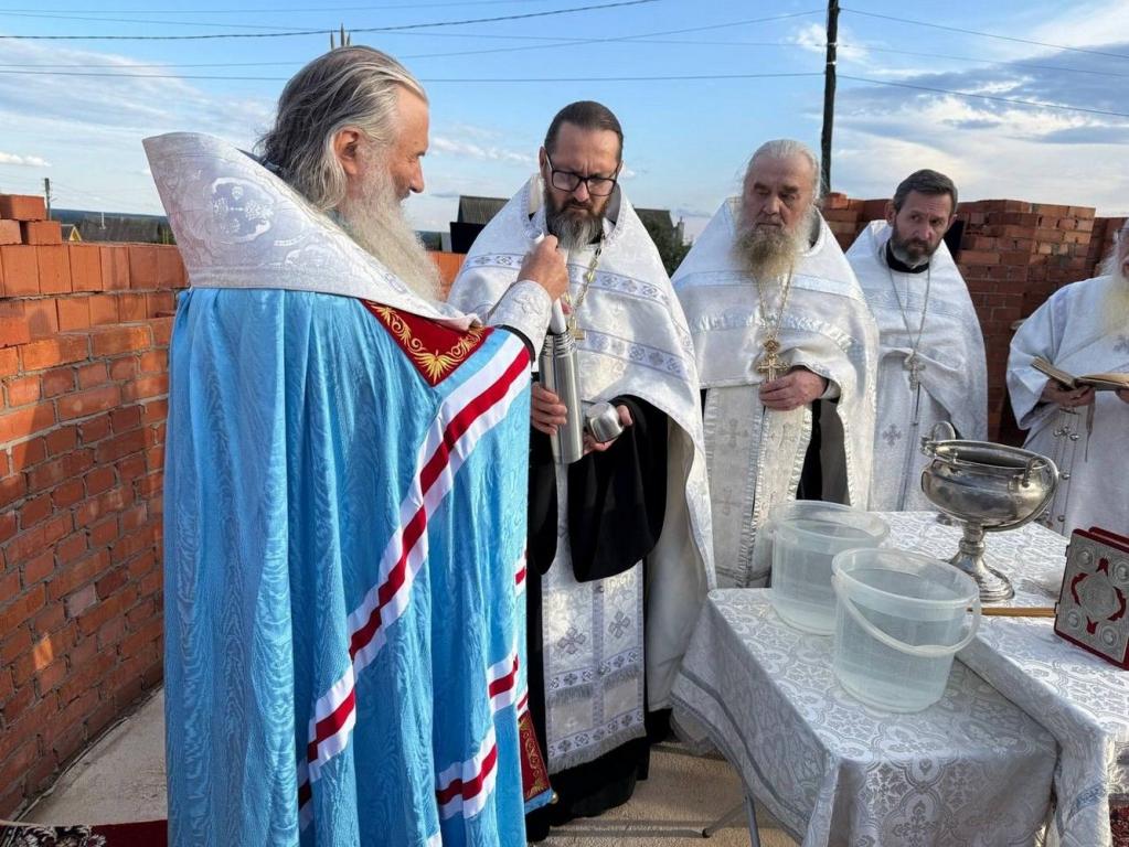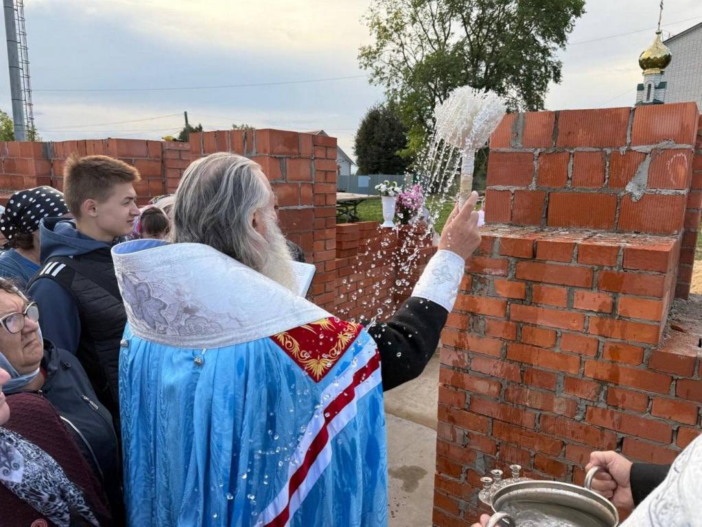 Владыка освятил камень в основании храма и зачитал закладную грамоту с указанием имени патриарха и мощей, которые будут заложены в престол. После чего капсулу с грамотой возложили в алтарную стену. Архипастырь с чтением молитв окропил святой водой все четыре стороны храма и поклонный крест.