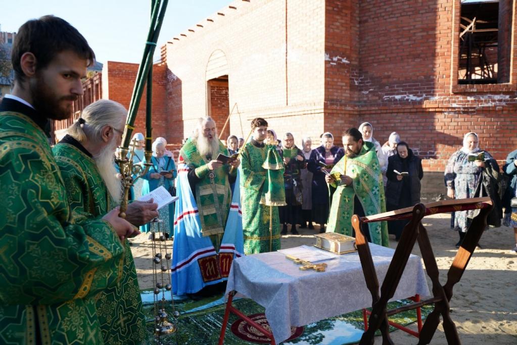 В завершение клирик Благовещенского кафедрального собора иерей Никифор Захаров окропил стены строящегося храма и всех верующих святой водой.
