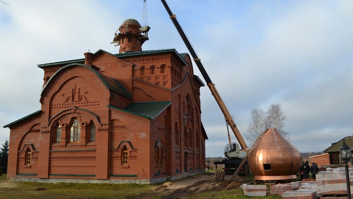 Главный купол собирали долго, а чтобы установить его на световой барабан, потребовалась специальная техника, которую заказывали в Йошкар-Оле. Несмотря на технические неполадки — сначала у машины спустило колесо, потом она завязла в глине, потребовался мелкий ремонт, во второй половине дня купол успешно установили на положенное ей место.