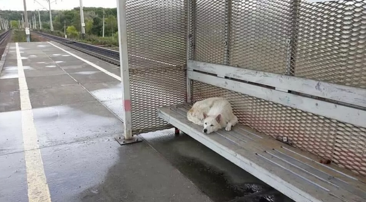 Белый пес, который сидел возле будки на железнодорожной платформе, привлёк её внимание ещё 11 сентября.